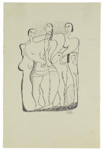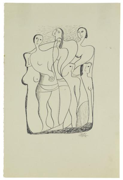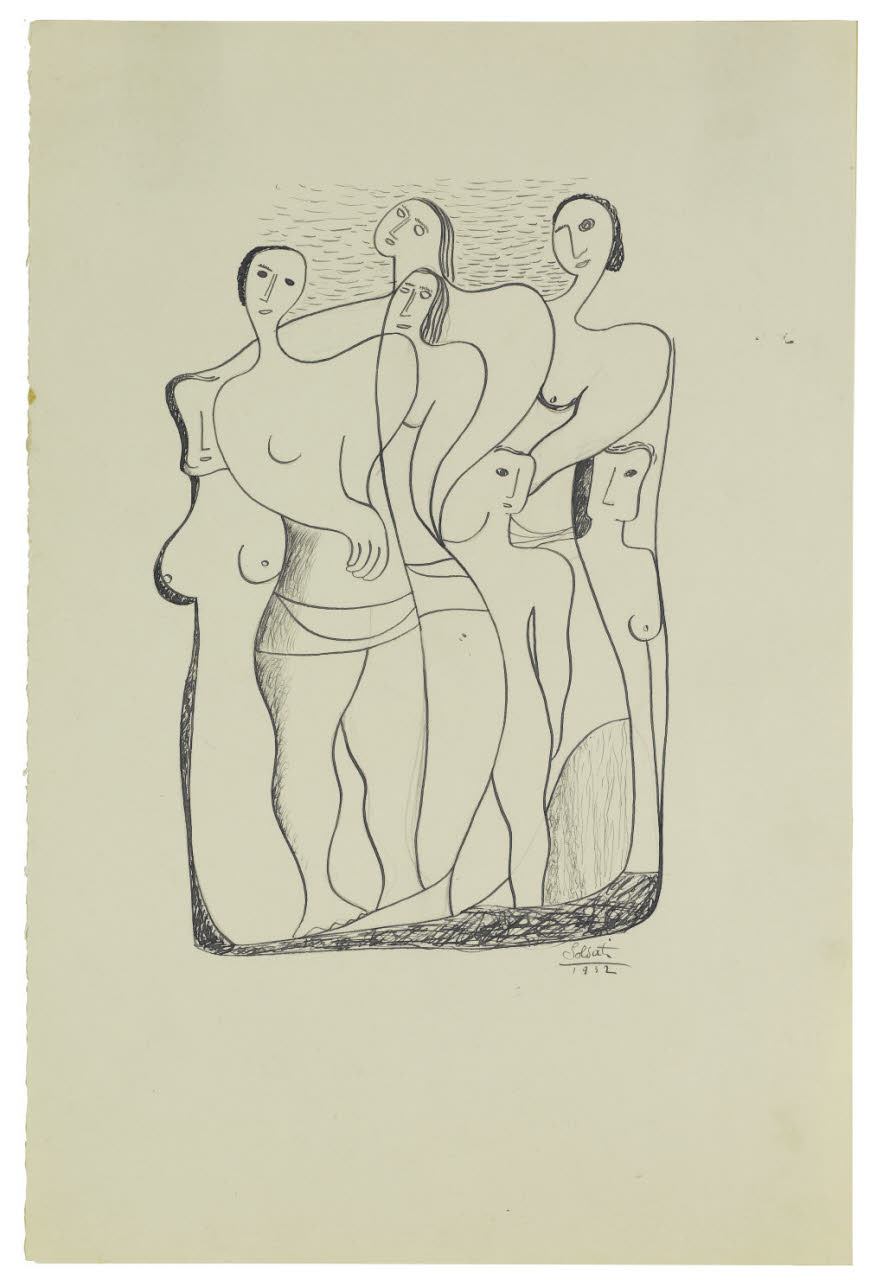 - NOTIZIE STORICO CRITICHE All'interno della Galleria del Milione, Atanasio Soldati è testimone delle innovazioni stilistiche della più moderna pittura; nel 1932 all'interno della galleria milanese espongono, infatti, Picasso, Léger, Gris, Marcoussis, ovvero tutti quegli artisti che incarnano la poetica del cubismo sintetico e da cui l'artista parmigiano sarà ispirato. Da non trascurare sono, oltre a queste ultime, le esperienze del Bauhaus e dell'ambiente tedesco che, a loro volta, avranno un peso ben preciso nell'arte di Soldati. Dunque, dopo un iniziale primitivismo figurativo oscillante tra persistenze metafisiche e richiami cubisti, intorno al 1933-1934, l'artista cambia direzione, dirigendosi verso un astrattismo di matrice essenzialmente lirico-narrativa, dove al suggestivo rimando metafisico si uniscono i riferimenti al tardo Cubismo sintetico, a Kandinskij e a Mondrian, oltre che alla lezione del Purismo europeo (G. Anzani, Tra secondo Futurismo e Astrattismo, in C. Pirovano, Disegno italiano del Novecento, Milano 1993, p. 176).\nL'acquisto presso l'artista, tra il 1933 e il 1934, di cinque disegni da datare al 1932 ("Allegoria musicale", "Composizione", "Gruppo di figure", "Figura femminile seduta" e "Figura femminile seminuda" - invv. B2400, B2401, B2402, B2403, B2399) mette in evidenza l'attenzione particolare per l'arte contemporanea dell'allora soprintendente Giorgio Nicodemi. L'interesse considerevole da parte di Soldati per quell'eleganza stilistica postcubista "oltrepassa gli ammiccamenti novecentisti per incamminarsi verso una personalissima mobilità formale lirico-evocativa" (A. Dallaj, Catalogo delle opere, in Da Modigliani a Fontana. Disegno italiano del XX secolo nelle Civiche Raccolte d'Arte di Milano, catalogo della mostra, a cura di M. Garberi, Milano 1991, p. 175). Tali rimandi sono presenti nei fogli nella forma di una morbida struttura grafica, accompagnata da una semplificazione linguistica che si attua utilizzando un tratto semplice e fluido di inchiostro nero che delinea le forme. Nelle composizioni vi è ancora traccia di un primitivismo figurativo, conformato ai modelli metafisici, che l'artista utilizzerà come mezzo espressivo in quei primi anni di carriera artistica. Siamo pertanto ancora lontani dalle nitide geometrie che contraddistingueranno le sue composizioni negli anni successivi.