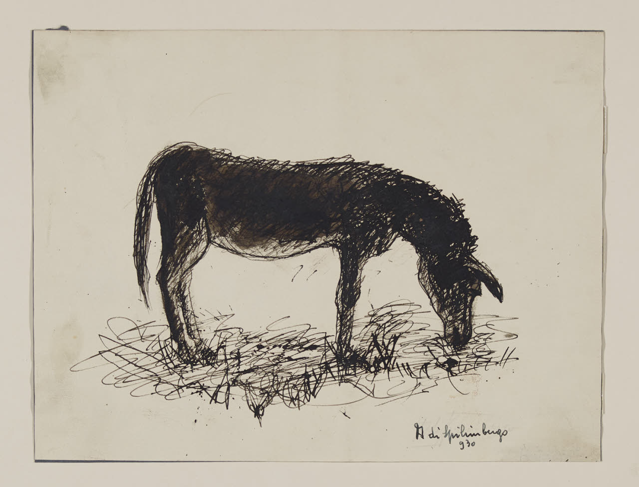 - NOTIZIE STORICO CRITICHE Nel maggio del 1930 Adriano Spilimbergo esordisce alla Galleria Baldi e qualche mese dopo espone con altri artisti in una collettiva presso la Galleria del Milione. Nel febbraio dell'anno successivo vi farà nuovamente ritorno stavolta con una personale di disegni. Con queste mostre, il giovane artista si fa apprezzare dalle maggiori testate giornalistiche locali, le quali sottolineano nei loro articoli il temperamento delicato e la sensibilità del segno del pittore. (Vilardi 2001-2002). Nel 1931 dalla Galleria del Milione, seppur non sia documentato in quale delle due occasioni sopra citate, le raccolte civiche milanesi acquistano di Spilimbergo due disegni denominati "Asinello al pascolo" e "Scena famigliare" (inv. 6578 B 2444). Il disegno "Asinello al pascolo" è realizzato attraverso un fitto tratto d'inchiostro di china che ne definisce la forma e ne riempie la struttura corporea. Per la naturalezza della figura e l'effetto luministico il disegno rimanda alla tipica tradizione pittorica lombarda (Ivi.). La massa corporea dell'asino al centro della composizione è descritta da sottilissimi ghirigori, a loro volta ricoperti da una densa acquerellatura d'inchiostro nero che ne risalta le forme e lo spazio circostante.