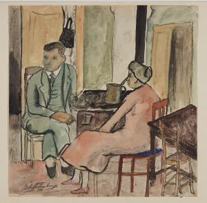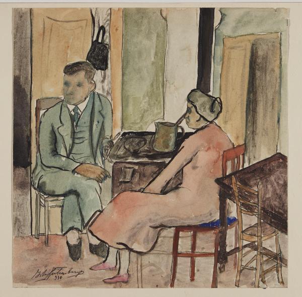 - NOTIZIE STORICO CRITICHE Nel maggio del 1930 Adriano Spilimbergo esordisce alla Galleria Baldi e qualche mese dopo espone con altri artisti in una collettiva presso la Galleria del Milione. Nel febbraio dell'anno successivo vi farà nuovamente ritorno, stavolta con una personale di disegni. Con queste mostre il giovane artista si fa apprezzare dalle maggiori testate giornalistiche locali, le quali sottolineano nei loro articoli il temperamento delicato e la sensibilità del segno del pittore. (Vilardi 2001-2002). Nel 1931, dalla Galleria del Milione, seppur non sia documentato in quale delle due occasioni sopra citate, le raccolte civiche milanesi acquistano di Spilimbergo due disegni denominati "Scena famigliare" e "Asinello al pascolo" (inv. 6577 B 2443). Il foglio "Scena famigliare" rappresenta, all'interno di una modesta stanza, due figure sedute vicine a una stufa. Il tratto nero d'inchiostro definisce le loro forme e il mobilio della stanza. Il disegno si caratterizza per la delicatezza e per l'eleganza di colori tenui acquerellati che si espandono sull'intero foglio e che rimandano a un primitivismo di derivazione post-impressionista. Come sottolineato da Elena Vilardi, "l'anticlassico di Spilimbergo si evidenzia nella descrizione delle figure poeticamente ineleganti e povere, fragili e volutamente inesatte nelle proporzioni anatomiche"(Ivi.).
