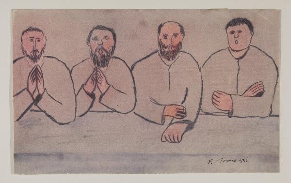 - NOTIZIE STORICO CRITICHE Tra il 1926 e il 1927 Fiorenzo Tomea studia presso l'Accademia Cignaroli di Verona, dove conosce Birolli e Manzù e nel 1928 a Milano inizia a frequentare i giovani artisti che orbitavano vicino a Edoardo Persico. Il critico nel 1931 presenta alla Galleria del Milione la prima mostra dell'artista, dalla quale l'anno successivo le Civiche Raccolte d'Arte milanesi acquistano due fogli: "I quattro apostoli" e "Schizzo di tre figure femminili" (inv. Au. A 1994). Tomea già nelle sue prime opere degli anni Trenta si orienta verso un'arte sacra ricca di spiritualità religiosa, genuina e popolare. Nel foglio con gli apostoli, infatti, un tratto elementare d'inchiostro definisce le sagome di quattro arcaiche figure maschili sedute al di là di un tavolo. Esse esibiscono una narrativa essenziale, dalla quale si traduce un'arte semplice ma non ingenua.