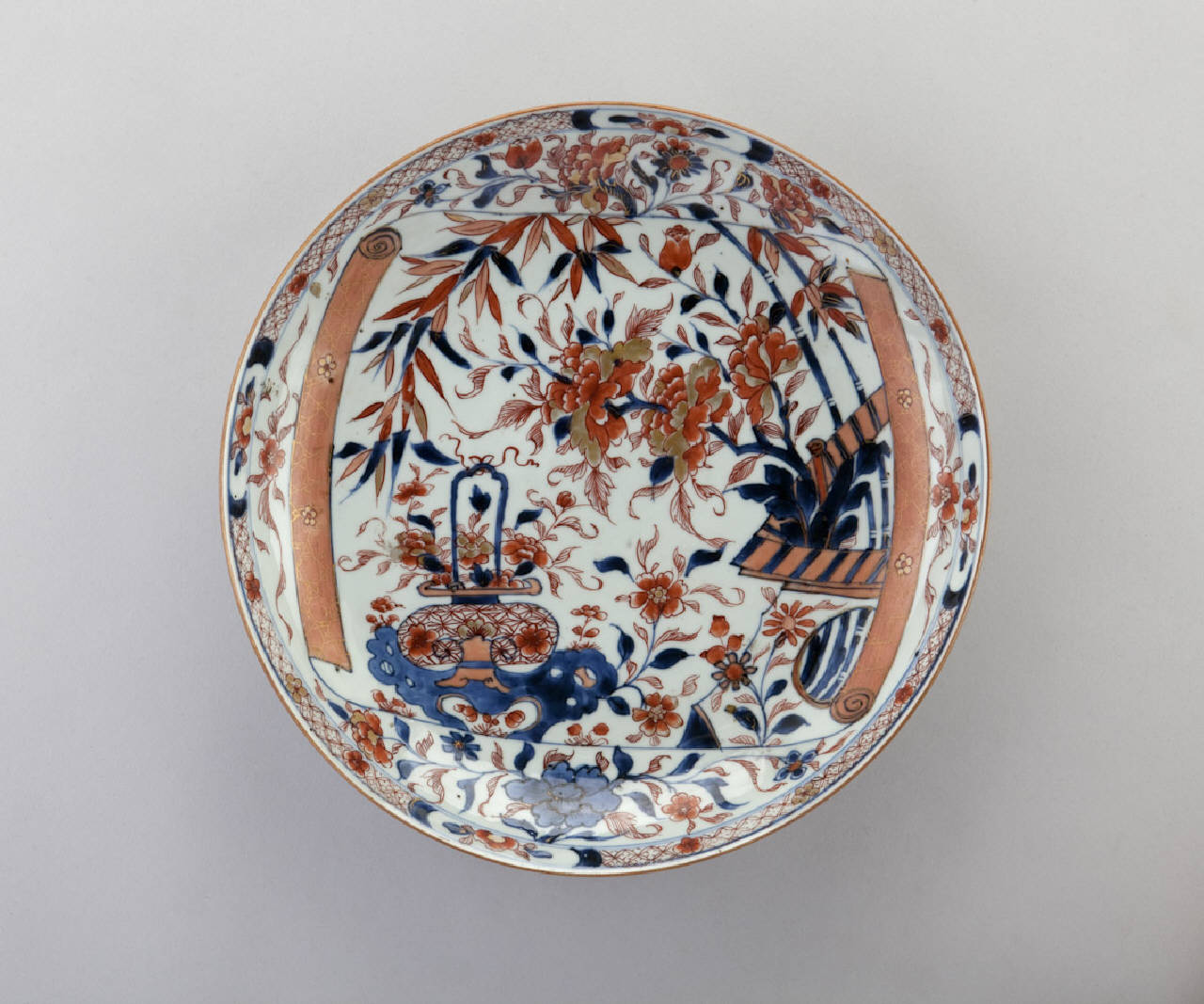Piatto fondo in porcellana a smalti Imari nei toni del blu e del rosso con lumeggiature decorato al centro con rami di bambù e e cesto di peonie in fiore all'interno di cartella a guisa di pergamena.