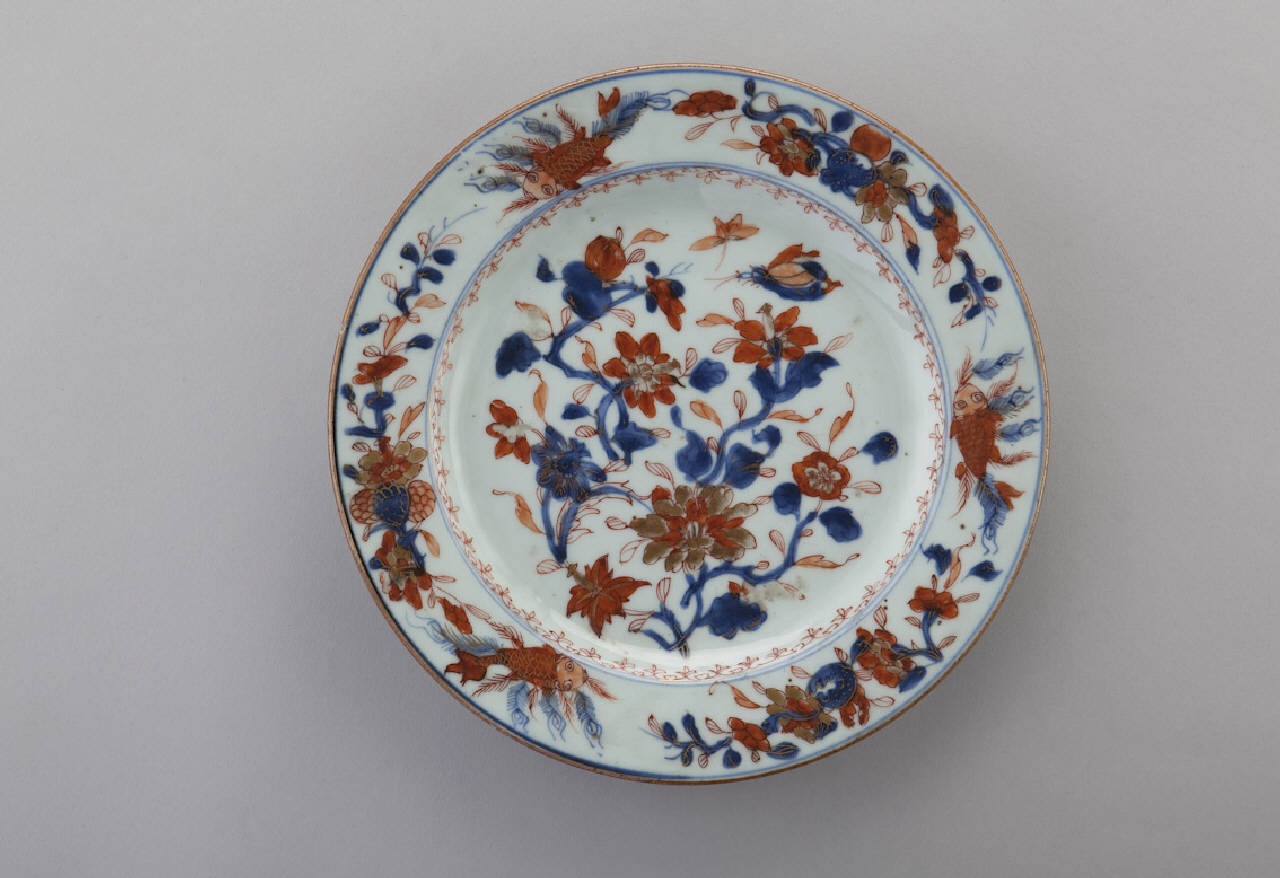 Piatto in porcellana a smalti Imari nei toni del blu e del rosso con lumeggiature, decorato al centro con rami di peonia in fiore, la tesa alterna carpe e motivi floreali.