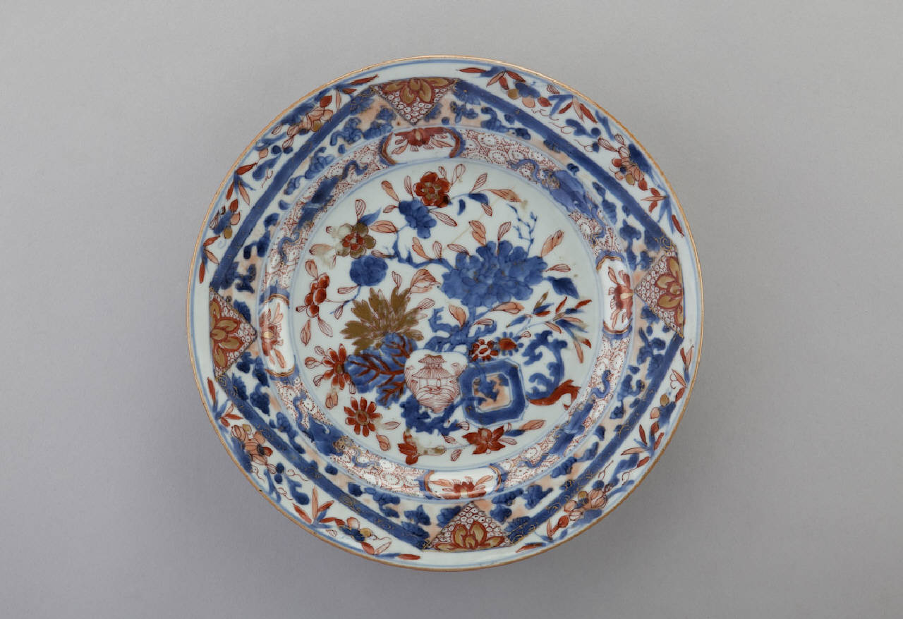 Piatto in porcellana a smalti Imari nei toni del blu e del rosso con lumeggiature, decorato con motivi floreali e geometrici.