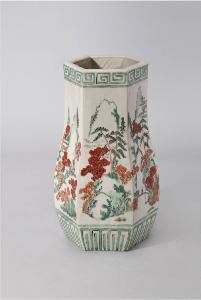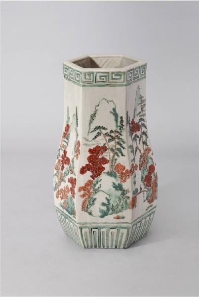 Vaso in ceramica dipinta a smalti policromi sopra l'invetriatura trasparente. A sezione esagonale, ha massimo diametro nella zona inferiore. La decorazione consiste in un paesaggio dettagliato di gusto cinese, con alberi, montagne, ponticelli e piccole figure umane. In alto, verso la bocca, banda con meandro di greche. In basso, verso la base, fascia con pannellatura verticale.