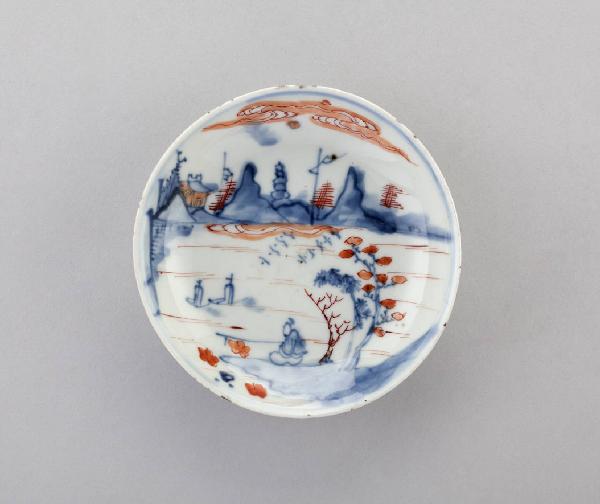 Piattino in porcellana a smalti Imari nei toni del rosso e del blu, decorato con scena di paesaggio.