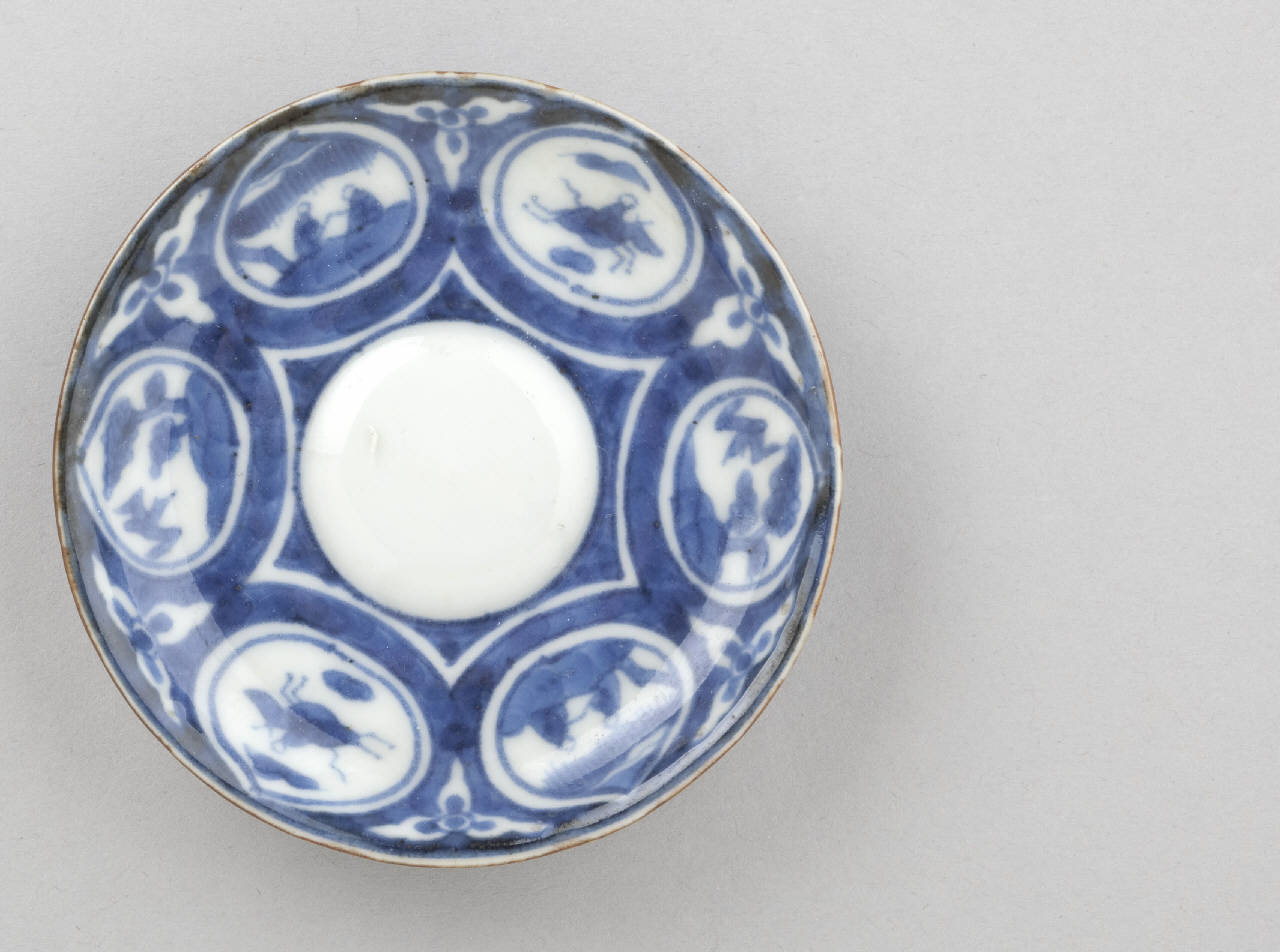 Piattino circolare in porcellana dipinto in blu al di sotto dell'invetriatura trasparente. Sulla superficie a vista, tra fondo e tesa, si stagliano radialmente sei riserve a goccia, all'interno di ognuna delle quali è raffigurata una piccola scena, tra scorci di paesaggio, figure, animali, fiori e uccelli.