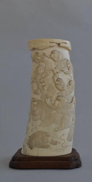Sezione di zanna d'elefante intagliata a bassorilievo raffigurante ventisei scimmie che si accalcano sulla superficie decorata eccitate dagli animali e dagli oggetti che stanno attorno: un rospo, un fiore di loto, un serpente, una libellula, dell'uva. In coppia con il precedente.