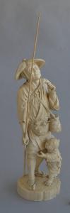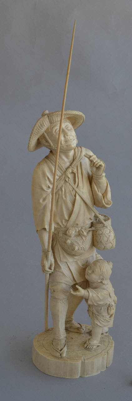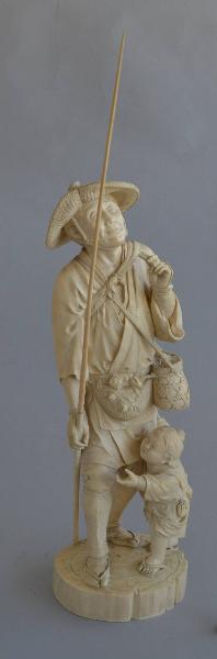 Scultura in avorio di cacciatore con una lunga canna poggiata a terra e retta nella mano destra, e un richiamo a due cannucce nella mano sinistra. L'uomo è vestito in abiti tradizionali, con sandali di corda, calze, copri stinchi, coperture per il dorso della mano, cappello di paglia, e un giacchetto stretto alla vita da una cintura che regge un netsuke a forma di mascherina di tengu (essere mitico con becco di corvo) dal quale pendono due contenitori cilindrici. L'uomo porta a tracolla un cesto intrecciato di vimini coperto da una rete, sulla schiena un fagotto e frontalmente, all'altezza del ventre, una borsa di rete dalla quale spuntano le teste di due uccellini. A fianco, un bambino vestito similmente, gli tira il giacchetto, ma l'uomo lo ignora e guarda verso l'alto con un leggero sorriso. La scena fa corpo con una bassa base circolare.