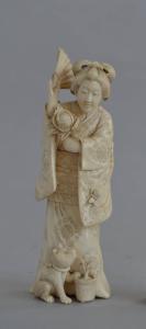 Statuetta di donna con ricca veste tradizionale a più strati, decorata a motifi floreali stilizzati, con ampia fascia centrale (obi) con fiocco portato sul retro. La dama regge un ventaglio nella mano destra e un fiore di peonia nella sinistra. Ai suoi piedi, un cagnolino tiene una zampina sul vaso di fiori che ha di fronte e fissa la farfalla che si è posata sull'ampia manica della donna.