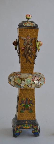 Vasetto d'argento laccato a fondo oro, costituito da due corpi opposti a tronco di piramide schiacciata ai vertici a formare una pianta romboidale, uniti al centro da un corpo sporgente a ciambella Il tronco di cono superiore ha il bordo in argento sopra il quale si incastra un coperchio d'argento dal profilo piramidale, con pomolo centrale a forma di bocciolo di loto semi schiuso, superficie superiore traforata a petali e su ogni lato quattro riserve lobate decorate a smalti cloisonnée con fiori. Il tronco di cono inferiore si inserisce su una base d'argento decorato in cloisonné, a forma di tavolino con ai vertici quattro piedini sagomati. Il corpo a ciambella è tutto incrostato di madreperla colorata corallo e carapace di tartaruga intagliati a fiori. p eLareti dei tronchi di cono sono dorate e decorate in chiaro scuro cone motivi geometrici ornati da tralci. Al centro di ogni faccia è applicato un medaglione d'argento e smalti cloisonnée, sotto a motivo di fiori e foglie e sopra a motivo di fenice. Una composizione di foglia e fiore di loto è applicata a ciascun vertice opposto in corrispondenza degli angoli acuti. Costituisce coppia con il precendente.