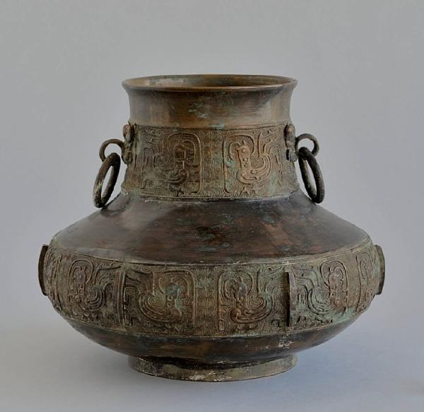 Riproduzione moderna di vaso rituale per il vino (hu) a forma di bottiglia schiacciata con collo largo da cui pendono due prese ad anello mobile. Decorazione a fasce con mascherone (taotie) a bassorilievo. Il vaso è ricoperto all'interno di colofonia con terra verde. Sotto, iscrizione di dieci caratteri arcaicistici.