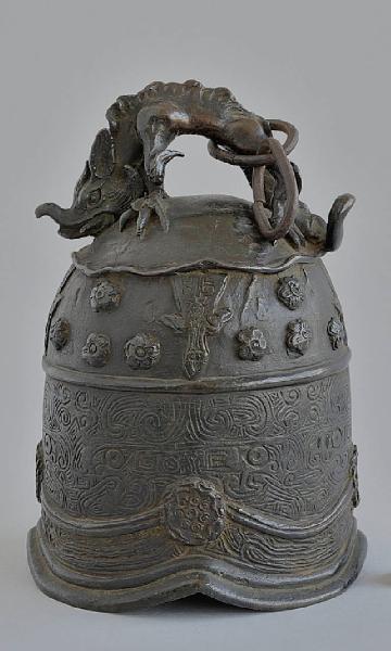 Campana "bianzhong" dal corpo cilindrico che si rastrema sfericamente alla sommità, sormontata da un occhiello a forma di drago (pulao) che sembra appigliarsi a una foglia di loto rovesciata. Sotto la foglia si trovano motivi a rilievo di nappe con nodi benaugurali nelle quattro direzioni, alternati superiormente da uno e appena sotto da una fila di tre medaglioni a fiore. L'ornato centrale del corpo è costituito da greche e volute incise a formare mascheroni (taotie) ed è delimitato superiormente da una fascia ad anello, e in basso da una fascia a festoni che unisce quattro medaglioni a fiore di loto stilizzato a otto petali. Sotto di questa, motivi incisi ondulati conducono al labbro, dal profilo ondulato sporgente esternamente a scalino. Attorno al drago, che forma l'occhiello, pendono i resti di una catena usata per la sospensione.