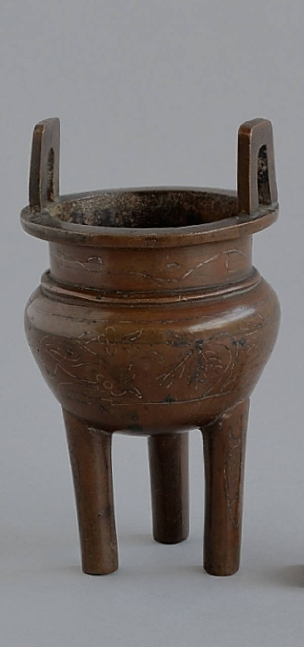 Incensiere di bronzo a forma di vaso tripode rituale (ding). Lunghe gambe tubolari, pancia semisferica a spalla alta che si rastrema in una fascia cilindrica terminante a labbro estruso orizzontalmente dal quale si dipartono due anse squadrate verticali. La pancia e la fascia sono interessati da motivi floreali ad intarsio d'argento.