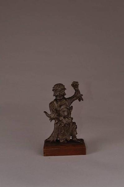 Scultura in bronzo raffigurante la deità taoista Liuhai intento a distrarre il suo rospo (mancante) a tre zampe con la sfilza di monete. La deità è raffigurata con il capo coperto e il ventre nudo. Sulla schiena porta una fiasca. La statuetta è saldata a una base di legno moderna tramite una vite.