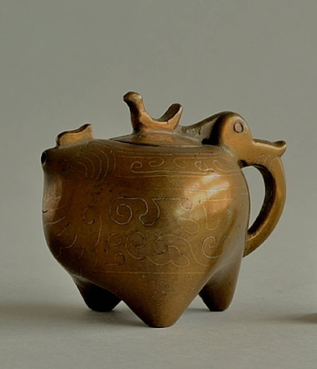 Contenitore dell'acqua per sciogliere l'inchiostro, a forma di piccola teiera con corpo bulbiforme a tre coste e tozze appendici a formare i piedini. Coperchietto con tiretto a forma di uccello stilizzato, apribile a ribalta con una cerniera assicurata a un ansa a gomito che si diparte dalla bocca di un drago. L'ornato è realizzato ad agemina di fili di rame, d'ottone e d'argento a volute ripartite su più fasce. Ottone patinato con riflessi rosso rame nei punti di contato colla superficie.