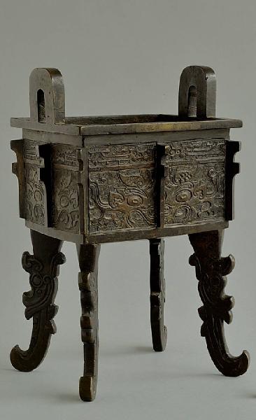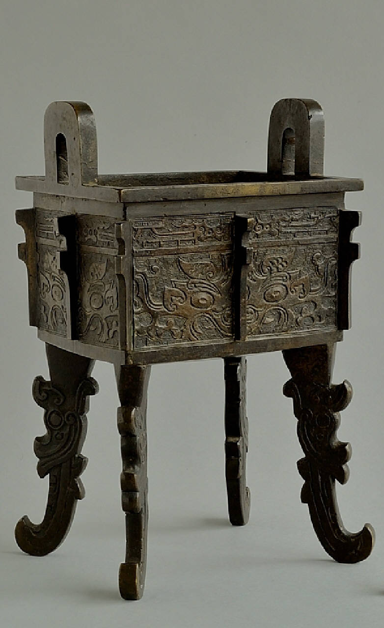 Incensiere a pianta rettangolare in bronzo (fangding) con decoro a rilievo di mascherone taotie sui quattro specchi. Sui lati minori, si dipartono verticalmente dal labbro due anse a ponte. Quattro gambe sagomate con mascheroni fantastici sono fissate diagonalmente al corpo.