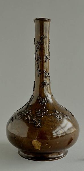Vaso a bottiglia con piede circolare e bassa pancia globulare schiacciata, terminante a lungo collo tubolare con bocca stretta e labbro stondato. La superficie superiore e del collo è ornata da racemi di susino a rilievo. Il fondo esterno è costituito da una piastra di bronzo ritagliata a rombi.