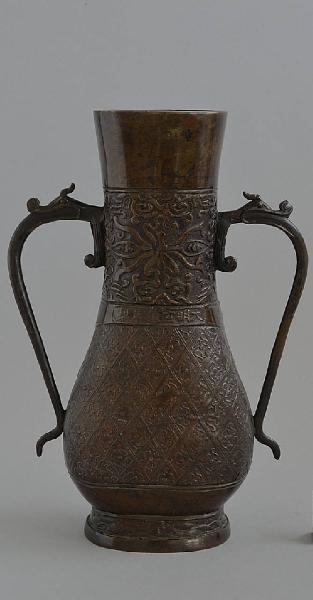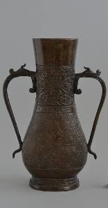 Vaso in bronzo a forma di fiasca a pianta ovale, con alto piede leggermente espanso e pancia bassa che si ratrema piriforme al collo per espandersi nuovamente verso la bocca, dal labbro piatto. Dal centro del collo si dipartono due lunghe prese a forma di drago che inghiotte un mostro dal corpo di serpe, terminanti sulla pancia. La decorazione è ripartita in due fasce principali: sul collo con motivo stilizzato di fiore di loto e sotto; sulla pancia a motivo di rombi campiti da un puntino e attorno motivi sinuosi a formare dei fiori molto stilizzati. Le due fasce sono separate da un marchio apocrifo Xuande. Il piede è decorato con motivo di onde.