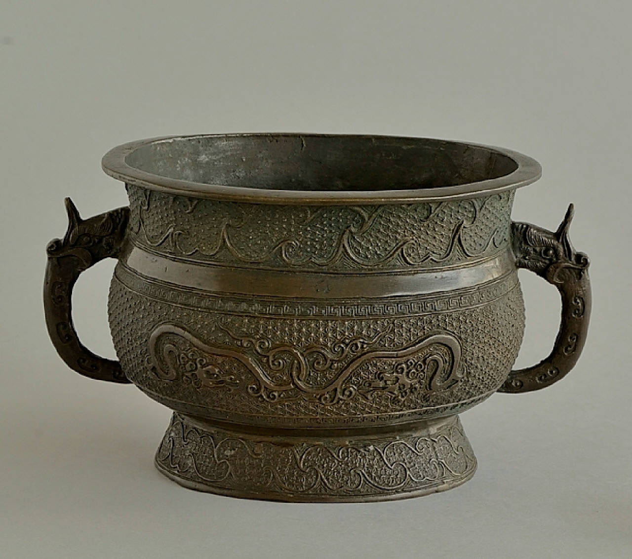 Piccolo incensiere da tempio nello stile dei vasi arcaicizzanti per l'offerta di cibi (gui), a forma di coppa ovoidale, biansata con basso piede leggermente espanso e collo strombato terminante a labbro orizzontale. La decorazione, a bassorilievo, è costituita dall'alto verso il basso: sul collo da motivi a onde campiti da un motivo a rete; sulla spalla da una fascia liscia; poco sotto la spalla da una fascia di greche (leiwen); sulla pancia da draghi affontati, con le code intrecciate, su un fondo a rete; sotto la pancia da greche (leiwen); sul piede nuovamente a motivi di onde campiti a motivi di moneta (qianwen). Le anse sono tipicamente a forma di protromi di unicorno che inghiottono un mostro dal corpo di serpente.