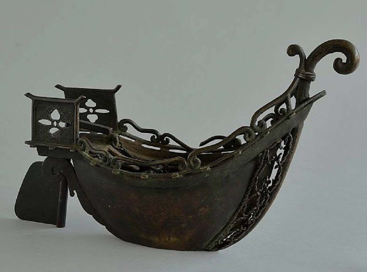 Incensiere a sospensione a forma di giunca cinese. Catenella per la sospensione. L'oggetto è formato da segmenti sinuosi, lamine di rame e di bronzo saldati assieme. La superfcie superiore è tutta traforata e presenta un foro rotondo centrale per permettere l'inserimento delle bacchette e delle pinzette usate per sistemare gli incensi. La parte frontale dello scafo riproduce delle corde intrecciate tra loro. Sul retro, due piastre verticali con impressi motivi ripetuti di spirali squadrate sono traforate a formare uno stemma (kamon) a forma di quattro petali trilobati a croce (juibana), simile nella forma al garofano stilizzato (choji). Alcuni segmenti sinuosi sono spezzati. Catenella in ferro a segmenti giuntati.