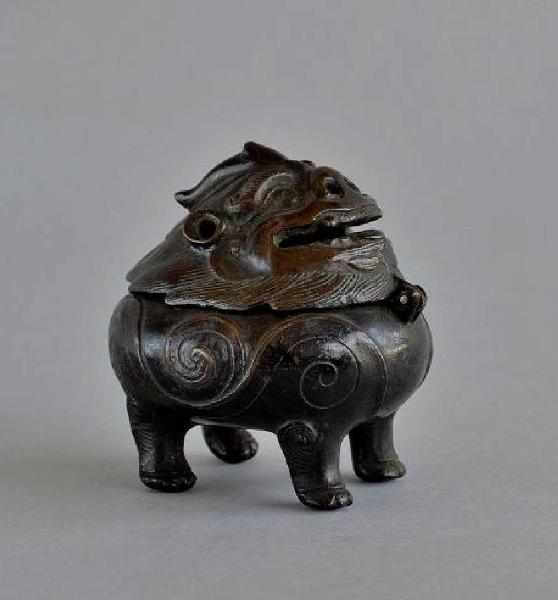 Incensiere a forma di chimera (pixiu) dal corpo tondeggiante. La testa, incernierata sul petto, copre tutto il corpo, tozzo e bombato, e può essere sollevata per accedere al fornello. Patina scura.