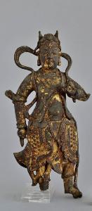 Scultura in bronzo dorato di Re celeste, stante, con copricapo ad alette e armatura con svolazzi che passano dietro il capo. Nella mano sinistra regge un oggetto non identificato, mentre la destra è indirizzata a terra, con medio e anulare piegati.