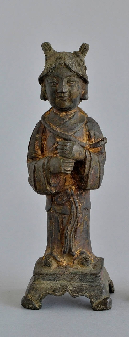 Scultura in bronzo raffigurante l'attendente a una divinità principale. Il personaggio è ritratto stante, con una lunga veste e la capigliatura che forma due codini verticali. Le mani sono congiunte, a pugno, nell'atto di reggere un oggetto, ora mancante. Un cappello appeso alla schiena. La statuetta fa corpo con la base quadrangolare modanata.