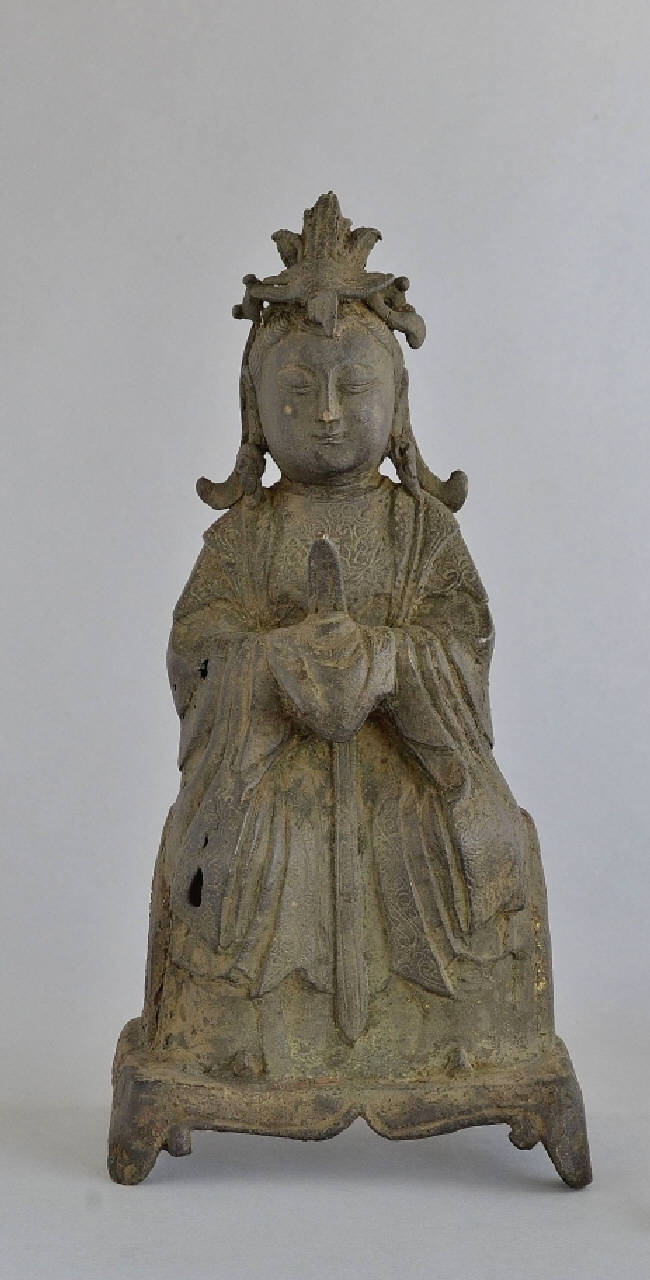 Scultura in bronzo raffigurante la divinità taoista Xiwangmu, regina madre dell'Ovest, è rapresentata come una donna seduta che indossa un'ampia veste tradizionale, con una tavoletta fra le mani, giunte, e una fenice sulla testa. La figura poggia su un piedistallo modanato con quattro piedini. Il bronzo è scuro con una leggera patina di ossidazione verdastra e segni di corrosione che hanno creato delle lacune.