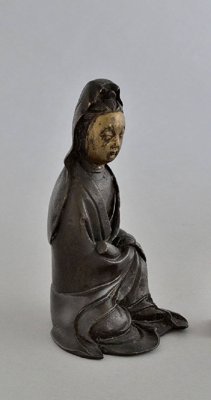 Piccola scultura in argento e metallo raffigurante di Guanyn (Avalokitesvara), accosciata, avvolta in lungo manto, con viso dorato rivolto a destra. Nelle mani regge un rotolo. Il panneggio della veste forma il basamento. Il viso e il petto sono dorati.