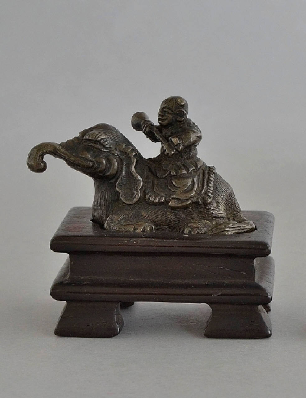Piccolo oggetto di bronzo raffigurante un bambino che cavalca un elefantino accosciato. Il bambino regge fra le mani un oggetto costituito da un'asta con un terminale a tronchi di cono opposti. L'oggetto si incastra, appoggiandosi, nella sagoma realizzata sul basamento in legno intagliato con quattro piedini.