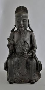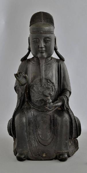 Scultura bronzo di figura di dignitario, assiso, con indosso un ampia veste con medaglione frontale campito da draghi, cappello da funzionario mandarino, barba e capelli lunghi che scendono posteriormente in due ciocche. Il personaggio regge con la mano sinistra una fiasca a zucca e la destra è alzata.