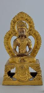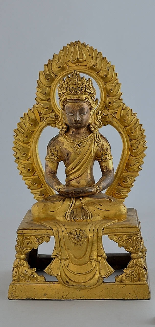 Scultura in bronzo dorato raffigurante il buddha di lunga vita Amita¡yus seduto nella posizione del loto, padmasana e le mani in dhyanamudra, su un trono coperto da un tessuto che ricade frontalmente e con aureola posteriore a doppia mandorla fiammeggiante. Piedistallo quadrangolare traforato e sagomato con motivi a doppia voluta con al centro una perla. Amita¡yus indossa tipicamente una corona a cinque cuspidi con nastri pendenti che ricadono sulle spalle. Il buddha ha un'alta protuberanza cranica (usnisa), con al centro il gioiello, e i capelli di colore blu che si dipartono dalla nuca in due ciocche che cadono sugli avambracci. Indossa la tipica veste indiana (dhoti), che lascia una spalla scoperta e indossa orecchini e una collana con tre pendenti. Un foro in corrispondenza delle mani.