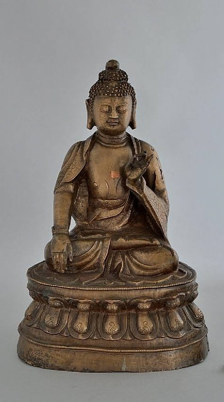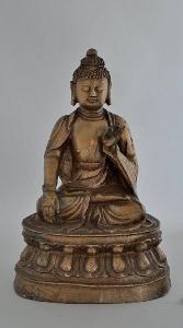 Scultura in bronzo di buddha con la mano destra nel gesto di toccare la terra (bhumisparsamudra) e con la sinistra nel gesto di esposizione della dottrina (vitarkamudra). La lega è di colore giallo chiaro, priva di doratura. Sul petto un inserto di rame. Sul retro del trono di loto una lunga iscrizione.
