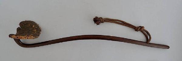 Scettro (ruyi) costituito da un manico ricurvo in legno e un fungo seccato a formare la testa. Sul retro, due iscrizioni a caratteri dorati e due quadratini di giada incastonati nel legno. Alla base si trova un foro passante con cordoncino giallo terminante in una nappetta.