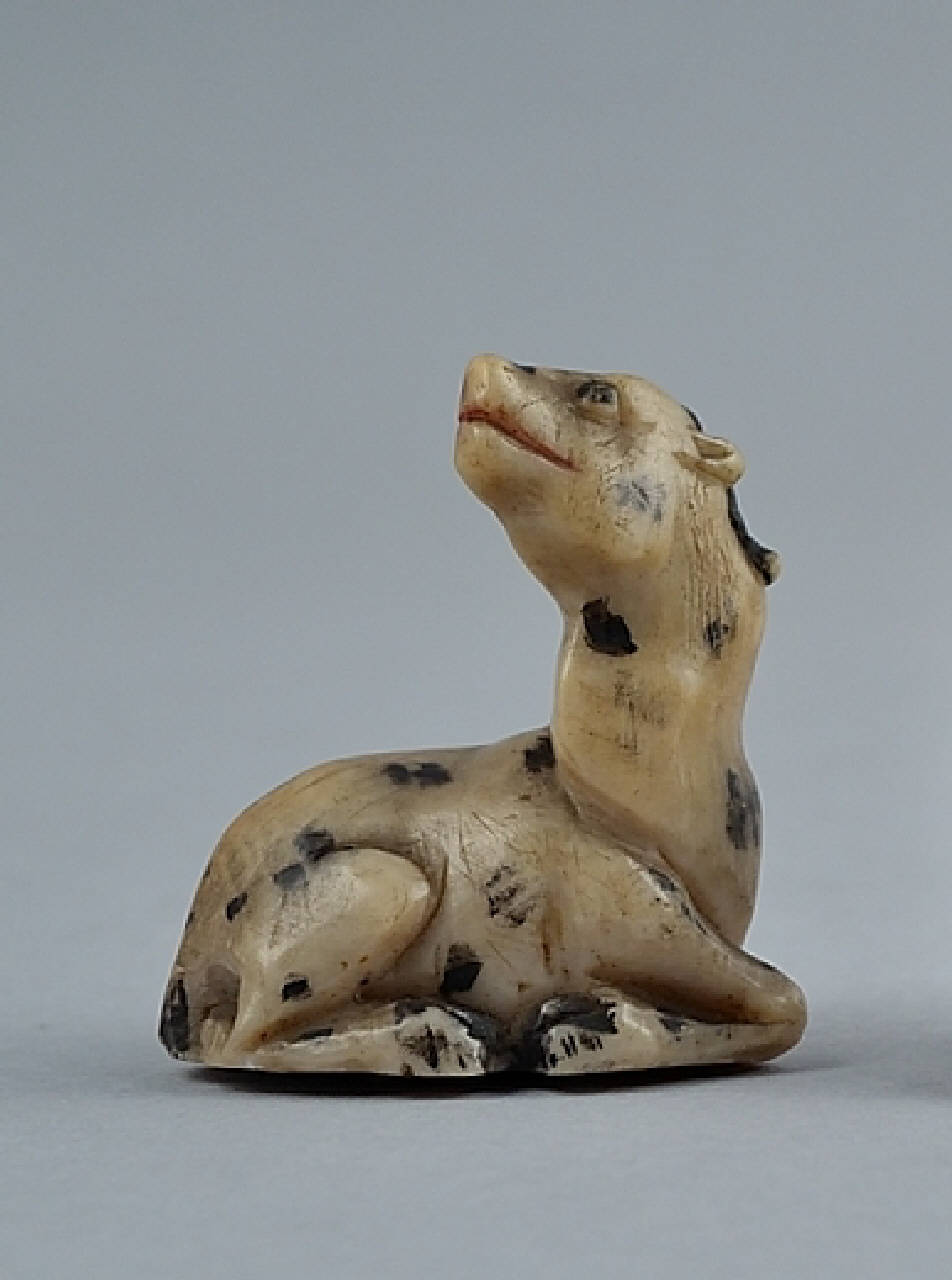 Piccola scultura in steatite di animale mitico Xiniu, ungulato, con il manto maculato, raffigurato tipicamente sdraiato, con la testa rivolta all'indietro. Particolari dipinti di nero.