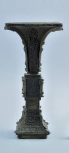 Vaso in bronzo arcaicistico per altare a pianta quadrangolare (fanggu) con costolature verticali sporgenti ai vertici, grande bocca fortemente espansa con labbro che termina orizzontalmente e piede leggermente espanso con base quadrata a bordo dritto, rientrante. Bronzo giallo chiaro con patina verdina in alcuni punti. Tutta la superficie è decorata con motivi arcaicistici a rilievo.