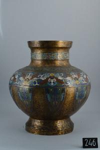 Vaso in bronzo dorato decorato a smalti champlevé nei colori bianco, azzurro, giallo, rosso, rosa e verde su fondo blu. Pancia sferica schiacciata ai poli, alto piede circolare espanso a parete concava che termina a base cilindrica, breve collo circolare, bocca con bordo obliquo. La decorazione è ripartita in fasce: sul collo a fiori entro motivi geometrici, sulla spalla a motivi sinuosi, sopra l'equatore a motivi floreali e sotto l'equatore a motivi di cicala arcaicistica stilizzata.