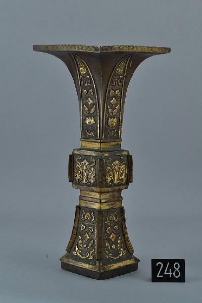 Vaso in bronzo arcaicistico per altare a pianta quadrangolare (fanggu) con costolature verticali sporgenti ai vertici, grande bocca fortemente espansa con labbro che termina orizzontalmente e piede leggermente espanso con base quadrata a bordo dritto, rientrante. Tutta la superficie è decorata con motivi arcaicistici a rilievo e dorata. In coppia con C247.