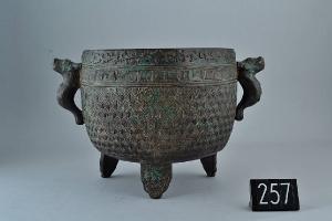 Incensiere tripode in bronzo dal corpo semisferico con piedini a fettuccia lobata e anse sinuose a protrrome bovina. La decorazione, impressa a rilievo, è costituita da una fascia a rilievo di tralci fitomorfi appena sotto il bordo, e più sotto da una fascia di greche a spirale quadra continua (leiwen), mentre il resto del corpo è interessato da un motivo di esagoni concentrici.