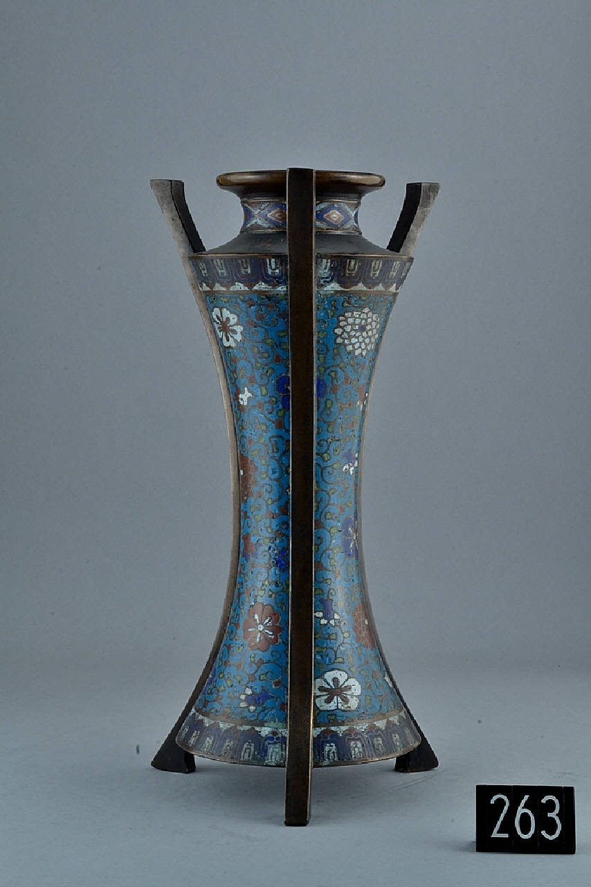 Vaso in bronzo a smalti champlevé di forma rotonda con profilo espanso a tromba alla base e alla spalla. La spalla, quasi orizzontale, prosegue in un breve collo che porta alla bocca, strombata con labbro everso. Il copro è unito a tre segmenti in bronzo che ne seguono il profilo in altezza, formando in basso tre piedini e in alto tre sporgenze che proseguono fino quasi alla della bocca. La decorazione principale è costituita da fiori su fondo di nuvole e lungo i bordi da fasce di petali stilizzati.