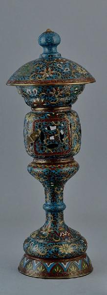 Lanterna in bronzo e smalti champlevé (azzurro, rosso, giallo, gialloscuro, bianco, verde) per altare decorata con motivo di fiori di loto e tralci fitomorfi.