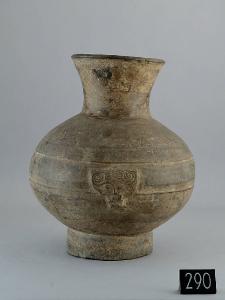 Vaso a giara (zhong) in terra cotta grigia a imitazione del bronzo. Forma ventricosa con fasce circolari a rilievo, alto piede cilindrico e collo svasato. Al centro della pancia si trovano due mascheroni a ricordare i fermi usati per agganciare gli anelli nei vasi rituali di bronzo.