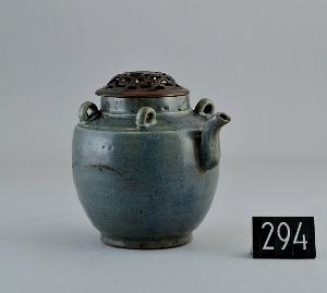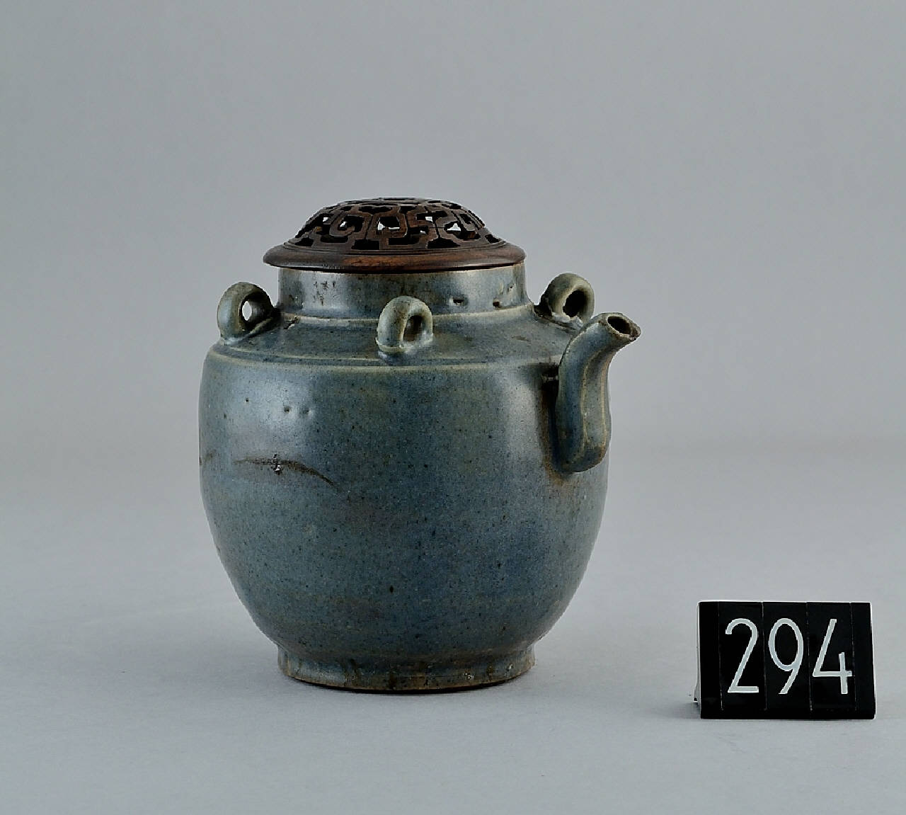Teiera in grés ad invetriatura monocroma azzurra, tipo jun. Basso piede circolare, con ventre espanso, alta spalla squadrata con sopra quattro occhielli per l'aggancio dei manici, ora mancanti. Coperchio a calotta in legno traforato, privo di pomolo.
