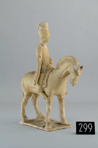 Statuetta di personaggio a cavallo. Il cavallo è stante, su un piedistallo rettangolare, con il capo leggermente reclinato, mentre il cavaliere ha la mano sinistra portata al petto e la destra avvolta nella manica. Dietro il cavaliere, sulla sinistra, ataccato alla sella pende un oggetto tubolare non meglio identificato.