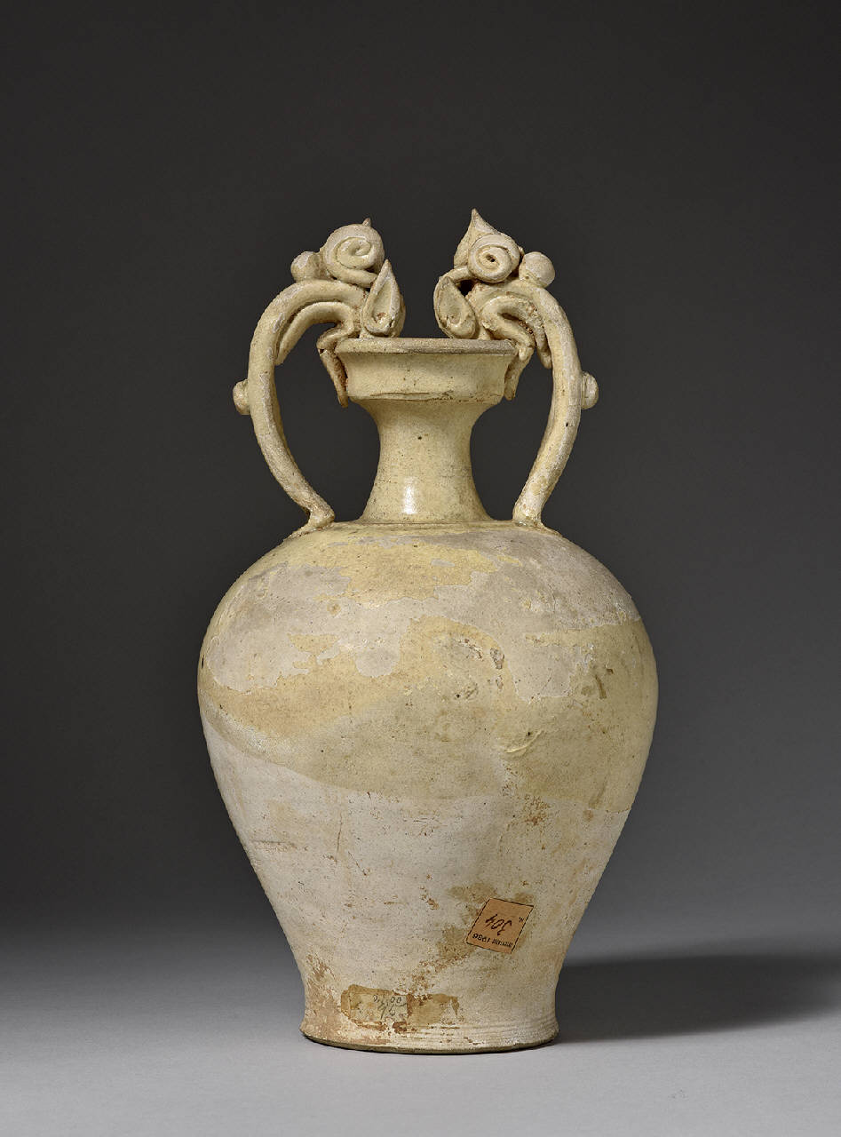 - NOTIZIE STORICO CRITICHE Etichetta rotonda bordo zigrinato:" Inv 1660, acquisto 1930".\nEtichetta quadrata:"Ep. Tang (618-906), vaso in terra dura smalto avorio / RARO / 3 / 2500".\nEtichetta inventario 1936.\n\n Indipendentemente dal fatto che servissero da contenitore o puramente per la decorazione, le anfore con questo tipo di anse a guisa di drago erano popolari nel nord della Cina durante la dinastia Tang ed erano regolarmente parte dei corredi funerari. La forma era già in voga dall'epoca della precedente dinastia Sui. Per esempi simili: v. "A Dictionary of Chinese Ceramics", Shanghai, 2002, pag. 49; dalle collezioni di The Art Institute di Chicago e The Metropolitan Museum of Art, sono state incluse nella mostra Chinese Ceramics from the Prehistoric Period through Ch'ien Lung, Los Angeles County Museum, 14 Marzo-27 Aprile, 1952, pag. 63, n. 85 e 86 (Mazzeo 2018)
