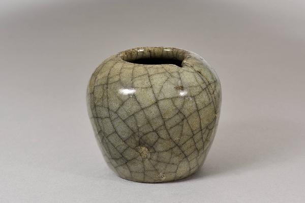 Piccolo vasetto per acqua, oggetto da scrittoio. Il corpo dalla forma panicuta, con apertura circolare in porcellana a invetriatura in stile ge nei toni del grigio con evidente craquelure.