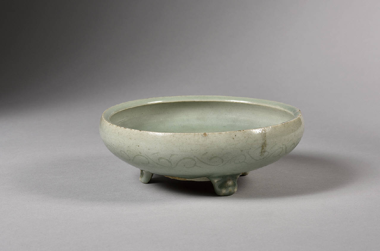 Bruciatore per incenso in ceramica spessa a smalto celadon verde chiaro che risparmia il centro, con tre piedini di forma zoomorfa (?) e decoro a motivi astratti inciso sottocoperta.