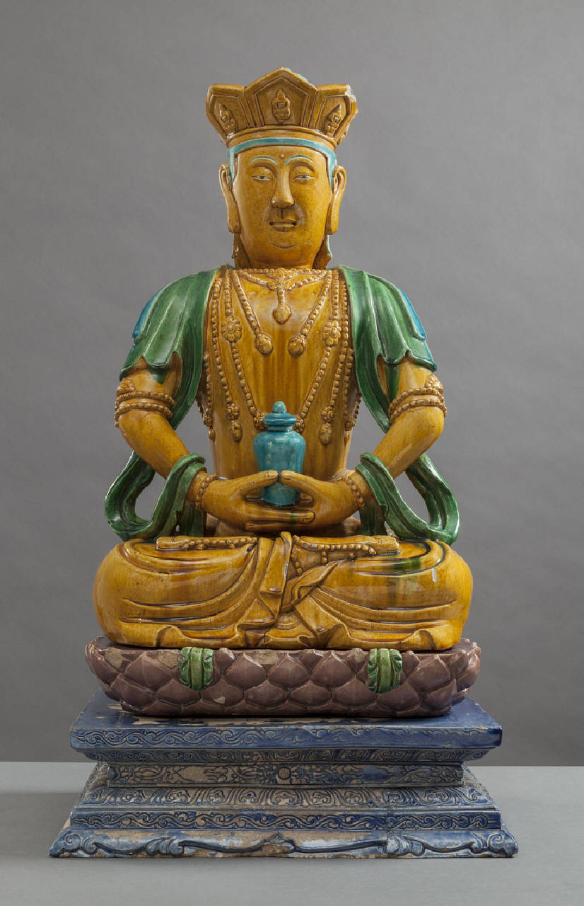 Buddha di "lunga vita" Amitayus in grès invetriato in giallo, verde azzurro, poggiante su un trono formato da un sostegno rettangolare smaltato d'azzurro con decoro a doppia fila di petali di loto.
