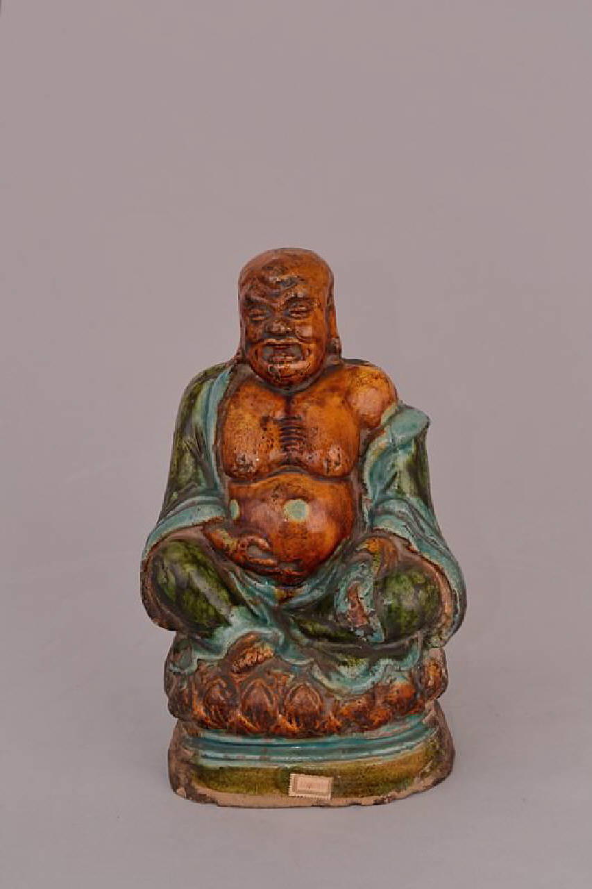 Scultura raffigurante Budai assiso su trono a guisa di fiore di loto, in bisquit con invetriautra a tre colori "sancai"marrone, verde e azzurro. La parte retrostante non invetriata. Stile Ming, produzione verosimilmente più del sec. XIX