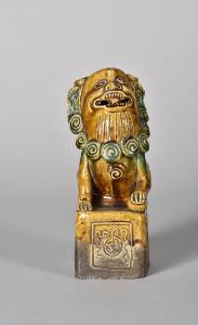 Ceramica invetriata giallo e verde. Leoncino cinese che tiene una palla sotto la zampa anteriore sinistra, su un piedistalo rettangolare che presenta il simbolo a cerchio traforato, sul fronte e sul retro, e un simbolo simile a uno scudetto sui fianchi. La metà inferiore della base non è invetriata.